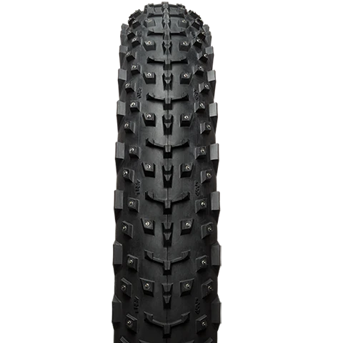 The newly redesigned Dillinger 4 studded tire is a serious performer for fatbike riders that enjoy challenges in the most demanding winter conditions. The new taller side lugs provide improved cornering in snowy conditions and the improved center tread provides even better rolling efficiency than before. And let’s not forget the 240 concave aluminium carbide studs that transporm this tire into a bobcat paw clawing its way up steep and icy section that would otherwise be unridable.