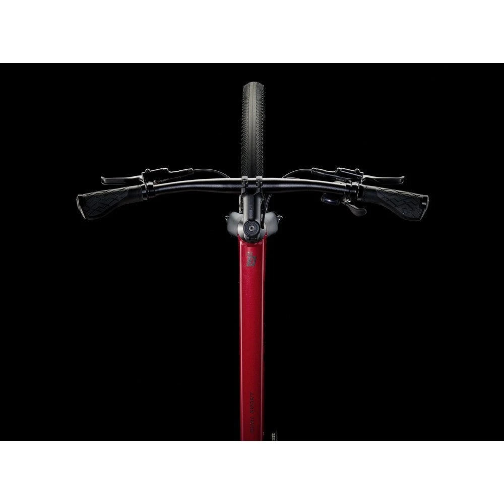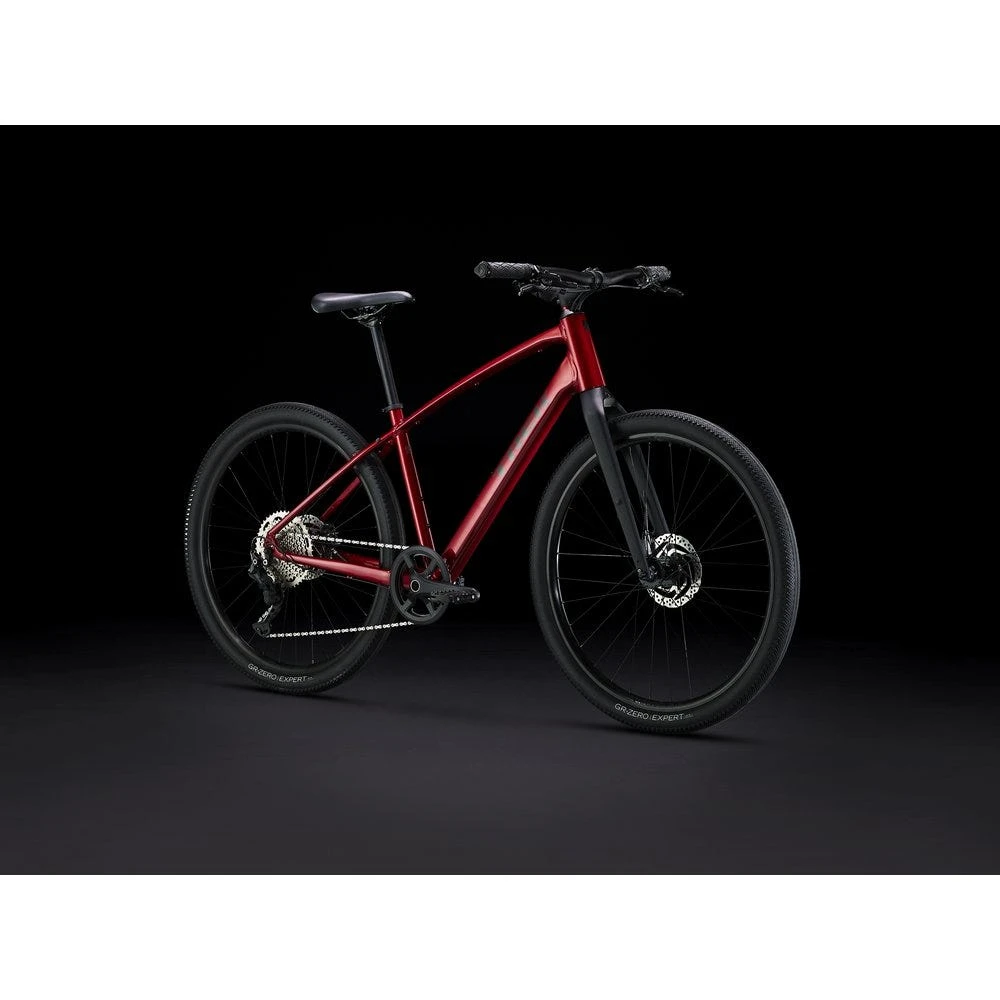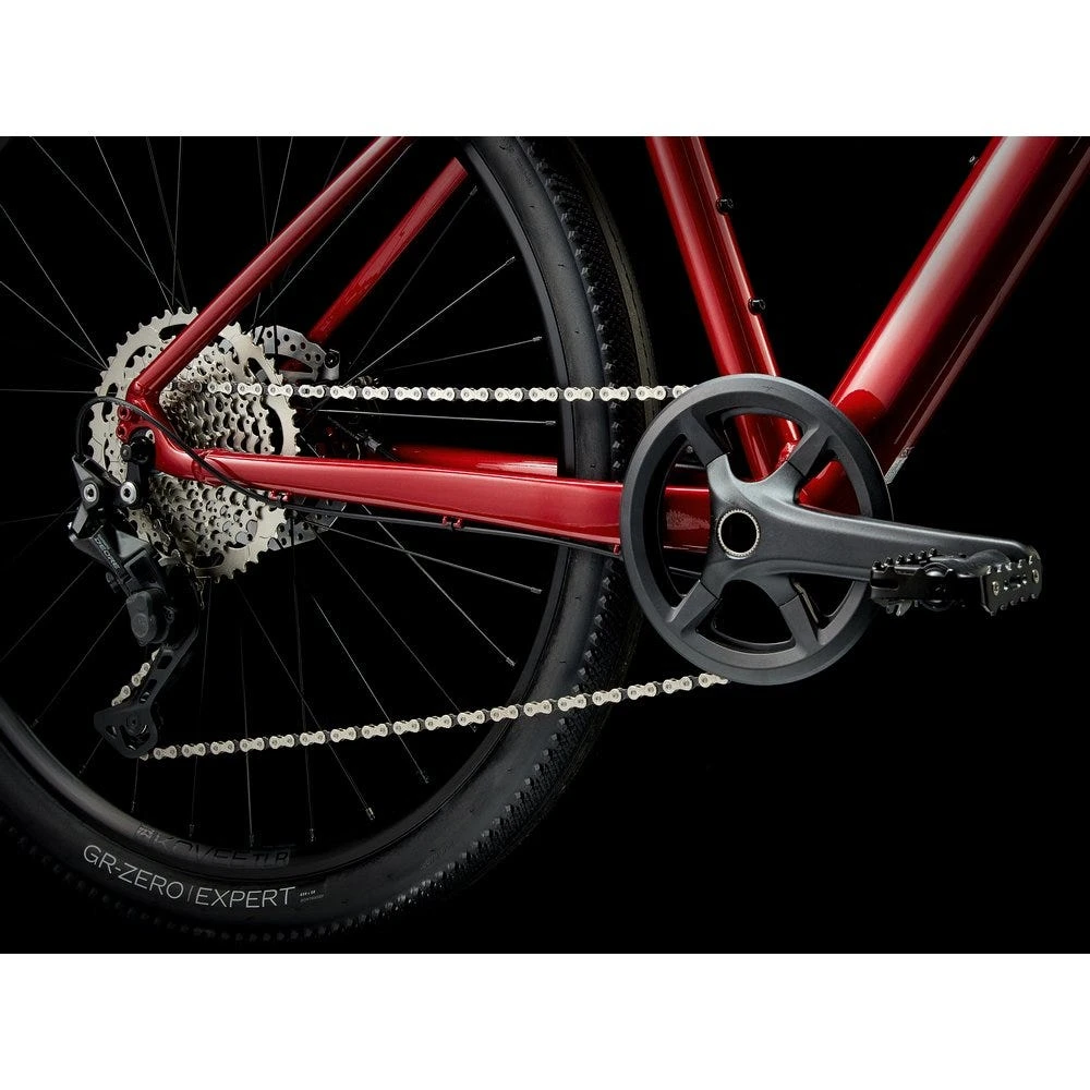 Dual Sport 3 is a high performance, go-anywhere hybrid bike that transitions from pavement to rougher terrain with ease. It has a light frame and a low-maintenance 1x drivetrain with a wide range of gears. Its wide Bontrager Kovee wheels and lofty gravel tires soak up bumps and rough terrain for a comfortable, confident ride on pavement, rail trails, and light dirt paths.